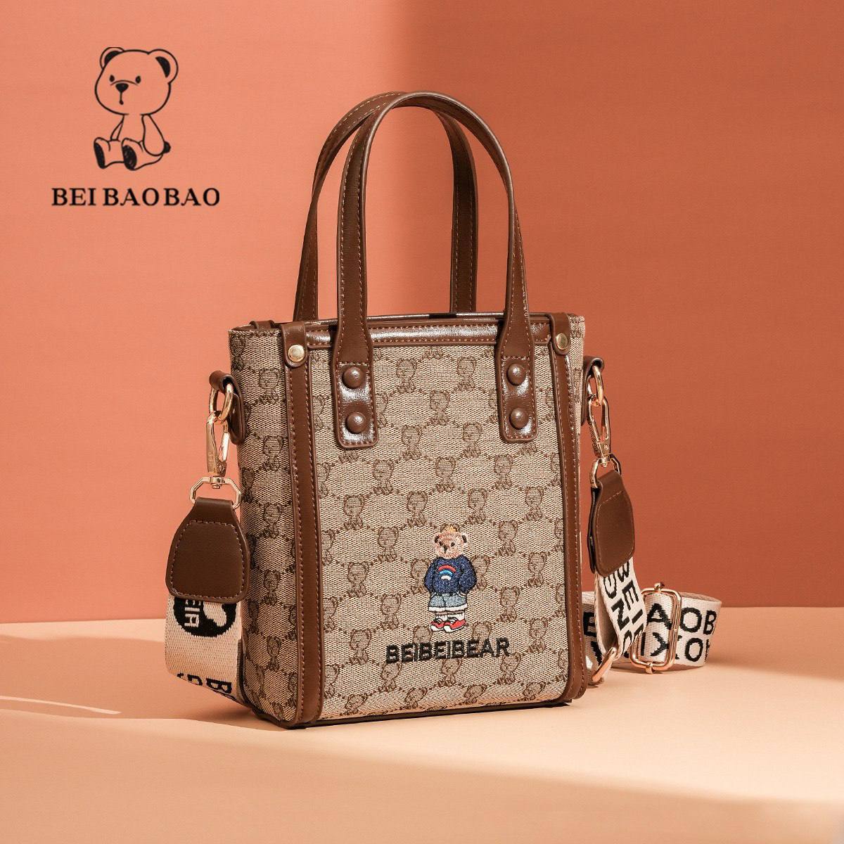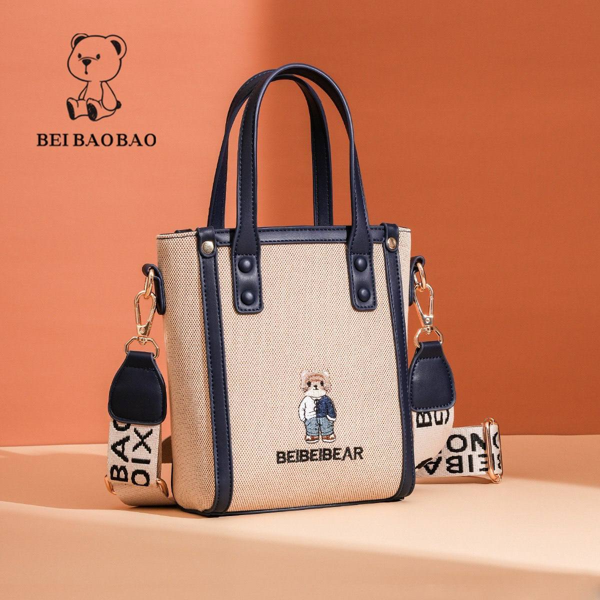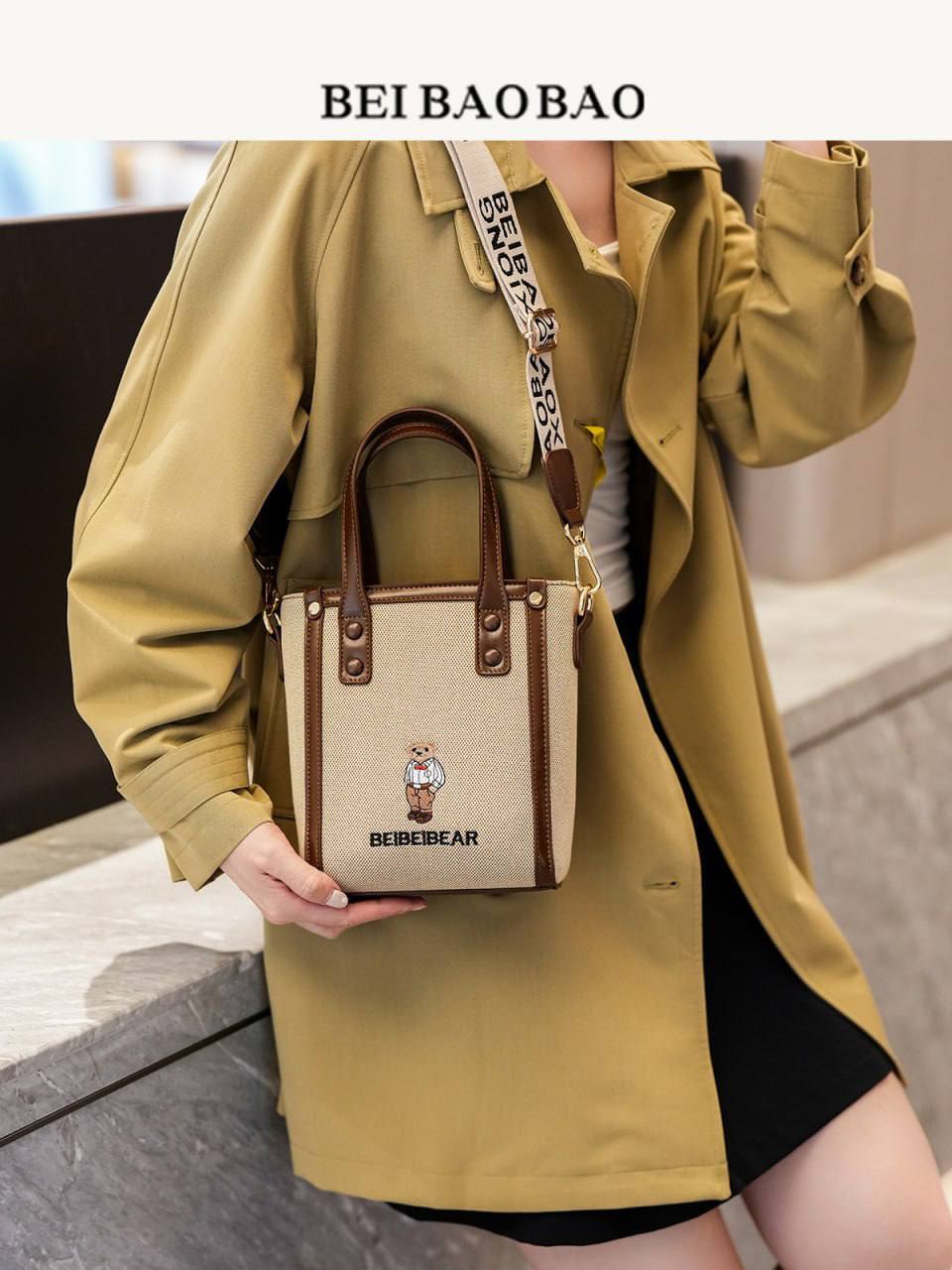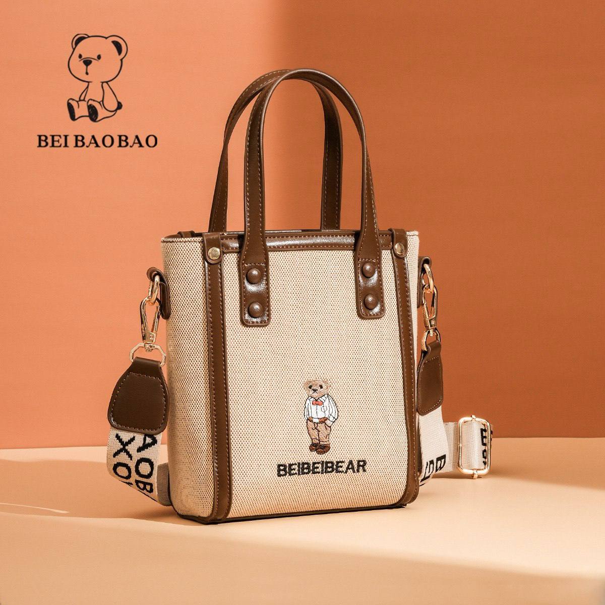 این کیف دستی کوچک شیک “BEIBAOBAO” با بدنه کرمی پارچهای، حاشیه آبی تیره و طرح گلدوزی خرس بامزه “BEIBEI BEAR”، ترکیبی از سادگی و جذابیت رو به نمایش میذاره! دسته بالا، بند شانهای با چاپ برند و سختافزار طلایی، استایل روزمرهات رو برای خرید، سفر یا مهمانیهای کژوال ارتقا میده. این اکسسوری مد روز رو بینظیر میکنه!