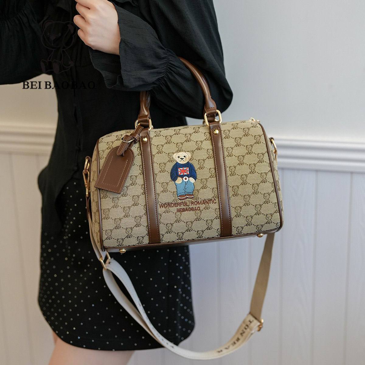 این کیف دستی بوستون شیک “BEIBAOBAO” با پارچه گلدوزیشده از خرسهای بامزه در لباسهای بریتانیایی، چتر، چای و پرچم اتحادیه، پر از تم انگلیسی جذاب! حاشیه چرم قهوهای، دسته بالا، بند شانهای با چاپ “BEI BAO BAO BEAR” و کیف سکه کوچک آویز، استایل روزمرهات رو لوکس و بازیگوش میکنه. پسزمینه گرم نارنجی و لوگوی خرسی، این اکسسوری مد روز رو برای سفرهای شهری و مهمانیهای کژوال ایدهآل میکنه!